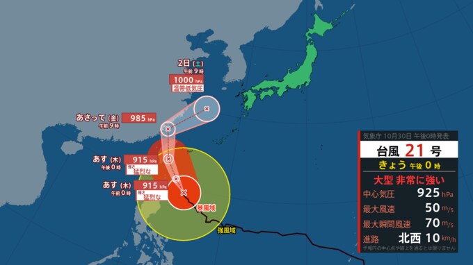 【全般台風情報】最新 台風21号「コンレイ」30日夜に『915 hPa』“猛烈な勢力”で沖縄の南へ北上か… 温帯低気圧になっても運んできた雨雲が…【2024年10月30日・午後2時20分更新+雨風シミュレーション追加】 青森テレビ 2024年10月30日(水) 14:20 国内 最新台風進路予想図