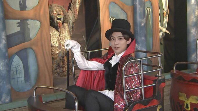 ハロウィーン前日のイベントということもあり、辰巳さんはドラキュラの仮装姿で登場。1951年に誕生した名物アトラクションの一つ、お化け屋敷の中をトロッコで巡る「スリラーカー」に早速乗り込んだ辰巳さんは、“めっちゃ緊張してます。お化けヤバいです。僕、今日これに乗るの今日初めて知ったんですよ“と、引きつり気味の笑顔。
