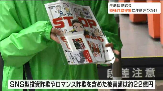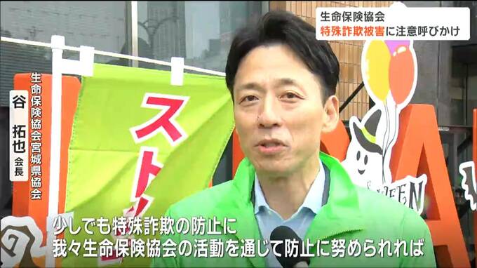 JR仙台駅前では、生命保険会社の社員や警察官ら35人が詐欺の手口が書かれたチラシなどを配り通行人に注意を呼びかけました。県の生命保険協会は、生命保険の解約金をだまし取る詐欺被害が全国で多発していることを受け、2019年に県警と協定を結び被害を防ぐための取り組みを続けています。