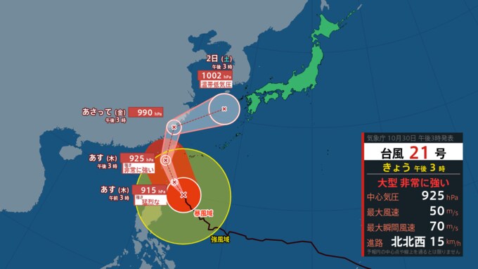 【全般台風情報】台風21号「コンレイ」今後『915hPa』“猛烈な勢力”で沖縄の南へ… 31日に『925hPa』で台湾上陸か【2024年10月30日・午後4時50分更新】 青森テレビ 2024年10月30日(水) 16:50 国内 最新台風進路予想図