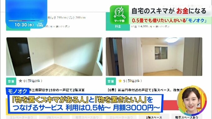 「モノを置くスキマがある人」と「モノを置きたい人」をつなげるサービス『モノオク』では、0.5畳から貸し出しOK。月額3000円から貸出料金の設定ができます。