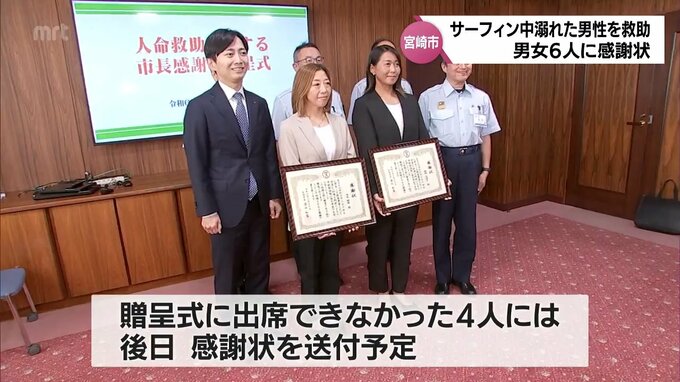 今年8月、宮崎市の木崎浜でサーフィン中におぼれた男性を救助した男女6人に宮崎市から感謝状が贈られました。感謝状が贈られたのは県内外に住む男女6人で、30日は、いずれも宮崎市内に住む西本都美さんと鵜狩佳奈…