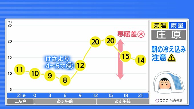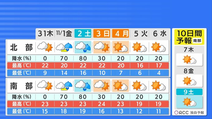 北部では朝の気温がきょうよりも4~5℃ほど低くなる見込みです。朝の冷え込みにご注意ください。日中の気温は、きょうよりもやや低い所が多いでしょう。南部では長袖1枚でちょうど良いくらいかと思います。