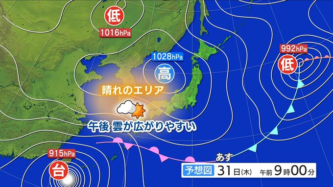 31日(木)雲が広がりやすい一日 日中は雲の隙間から日差しも届く 日中の気温きょうよりもやや低い