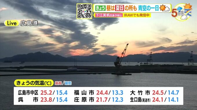きょう30日(水)の広島県は、久しぶりにカラッと秋晴れでしたね。日中は北風が強めに吹いた時間もありましたが、過ごしやすい陽気でした。日中の最高気温は、広島市中区できのうより5℃以上高く25.2℃まで上がり、10月上旬並みの気温になりました。けさは、上空にびっしりとひつじ雲が広がっていました。空を見上げるのも楽しくなる季節ですね。