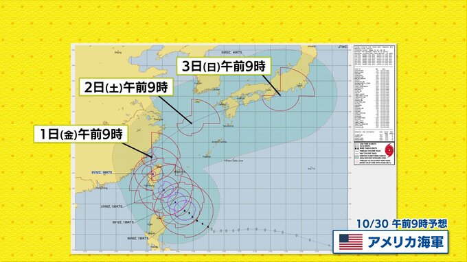 台湾を直撃後勢力は急速に衰える予想で、本州に近づく頃には温帯低気圧化するでしょう。ただ、この台風21号から変わる温帯低気圧の影響が金曜日から3連休の初日の2日土曜日に出る見込みです。土曜日には、温帯低気圧が前線に取り込まれ、湿った空気の流れ込み具合によってはまとまった雨の可能性があります。今後の雨の情報に注意してください。
