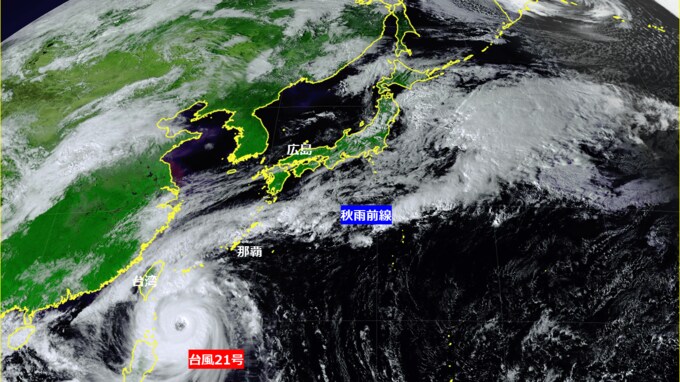 台風21号は現哀フィリピンの東の海上にあり、非常に強い勢力まで発達しています。現在海面水温がこの時期としては異常に高く、高気圧の勢力も強いため、この時期としては異例の進路をとる見込みです。この後猛烈な勢力まで発達し、台湾に直撃する予想です。