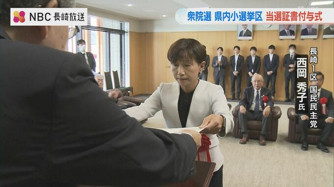 今月27日に投開票が行われた衆議院議員選挙の県内小選挙区の当選者に、30日県庁で当選証書が手渡されました。当選証書付与式に出席したのは、長崎1区で当選した国民民主党の西岡秀子さんと2区で当選した自民党の加…