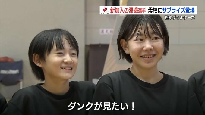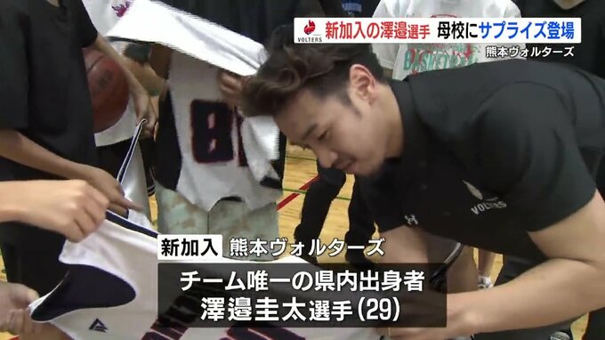 体育館で練習に励んでいるのは、宇土市の鶴城(かくじょう)中学校のバスケットボール部員たち。そこに現れたのは、今シーズン熊本ヴォルターズに加入したチーム唯一の県内出身プレイヤー澤邉圭太選手です。
