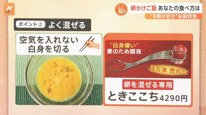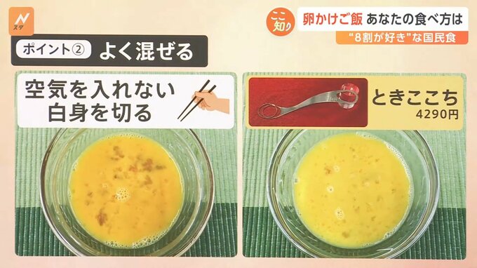 2つ目のポイントは、よく混ぜることです。やはり白身のドゥルンといった感じがあまり得意ではないという方もいらっしゃるかと思います。空気を入れずに白身を切るように混ぜると美味しく食べられるのですが、卵を混ぜる専用のスプーンが登場しています。