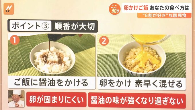ご飯に醤油をかけると少しご飯が冷めるので、卵が熱々のご飯の上にかからず固まりにくくなる、醤油の味が強くなりすぎず、卵の美味しさをより味わえるということです。