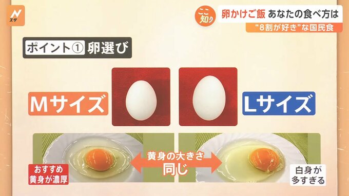 そして、美味しく卵かけご飯をいただくポイントも教えていただきました。1つ目のポイントは卵選びです。MサイズかLサイズ、どちらが卵かけご飯に最適だと思いますか。