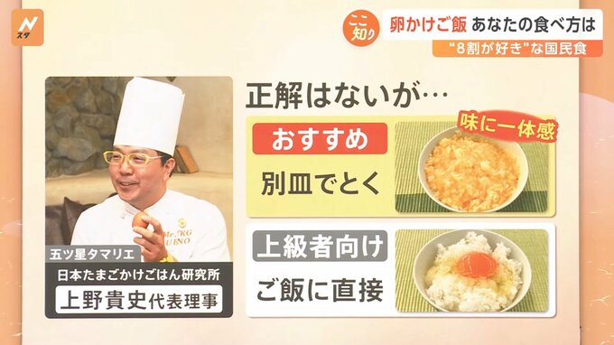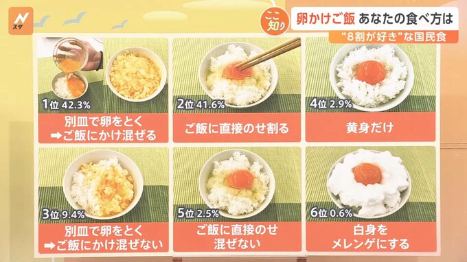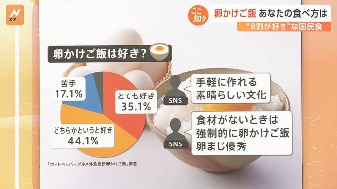 8割ぐらいの人が「好き」と答えました。SNSでは「手軽に作れる素晴らしい文化」「食材がないときは強制的に卵かけご飯。卵まじ優秀」という声も上がっています。