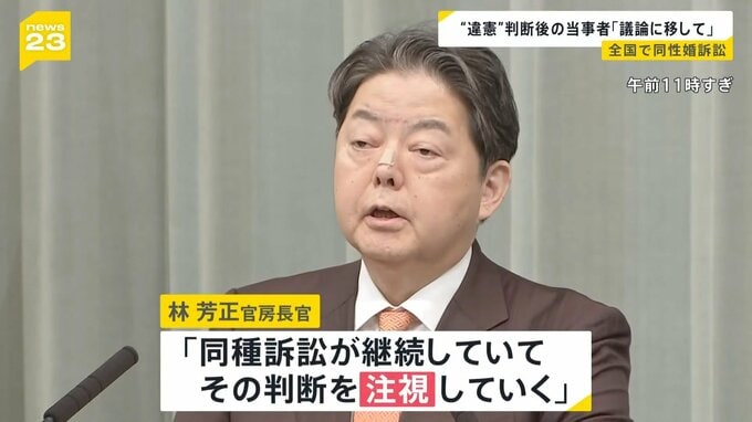 同性婚をめぐる裁判は各地で行われていて、林 芳正 官房長官は「同種訴訟が継続していて、その判断を『注視』していく」としています。
