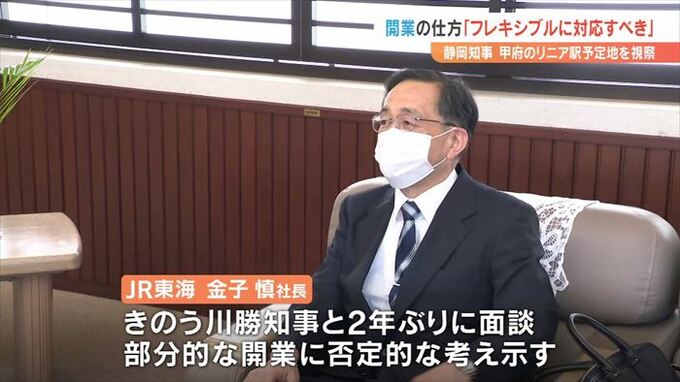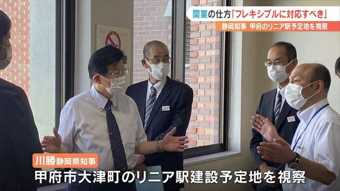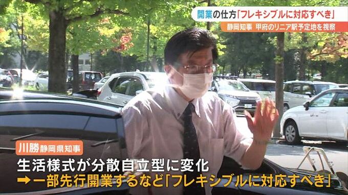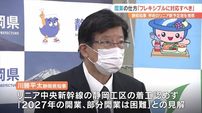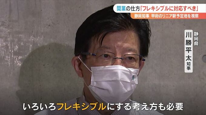 14日に静岡県の川勝平太知事が山梨県甲府市のリニア駅建設予定地を視察し、開業の仕方について「フレキシブルに対応すべき」という考えを示しました。