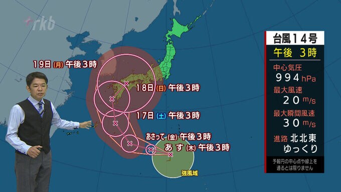 台風14号は、東京都から南に約1000キロ離れた小笠原諸島付近の海上をゆっくりと北へ進んでいます。この先の進路ははっきりとしないものの、沖縄方面に進み、さらに3連休中に福岡にも接近するおそれがあ…