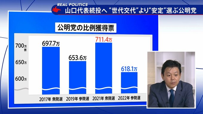 そうですね。世代交代という観点からも石井幹事長に次の代表を譲るのでは、という見方も出ていました。党内の事情があって続投の流れになりました。そして2023年春には統一地方選挙があります。組織政党である公明党は支持団体である創価学会の支援もそうですが、地方組織、要するに地方議員が国政選挙の時に一致結束して組織で選挙を行っていく党です。ですから衆参両院の国政選挙と同じくらい重要な選挙です。このため、より安定感のある山口代表に創価学会からの評価も高いです。より安定した選択肢として、続投が優先されたのだと思います。
