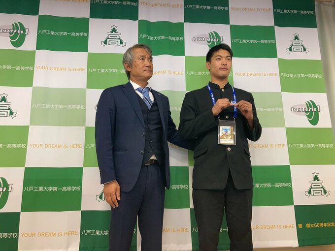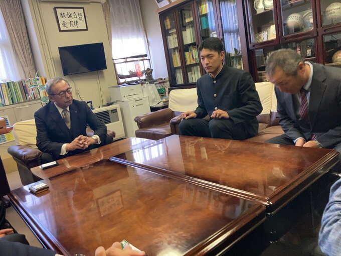 金渕投手は31日、青森県八戸市内の同校で河野亮アマスカウトと八馬幹典アマスカウティングディレクターから指名あいさつを受けた。