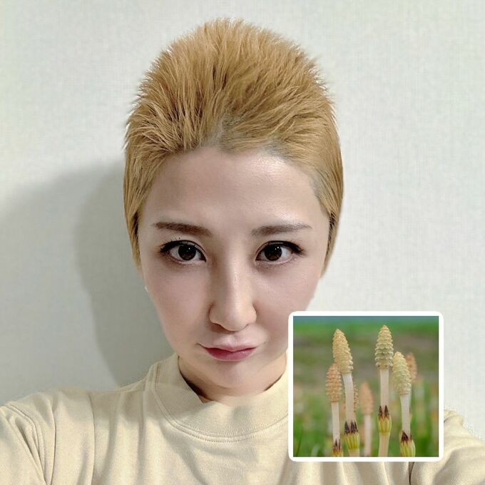 すると「秋が深まる昨今ではございますが、季節外れの#つくしを発見。」と、金髪に染められた髪が頭頂部に行くにしたがって立ち上がり、縦長の卵形の頭になっている西丸さんは、つくしの写真を付けて自撮り写真を投稿しています。