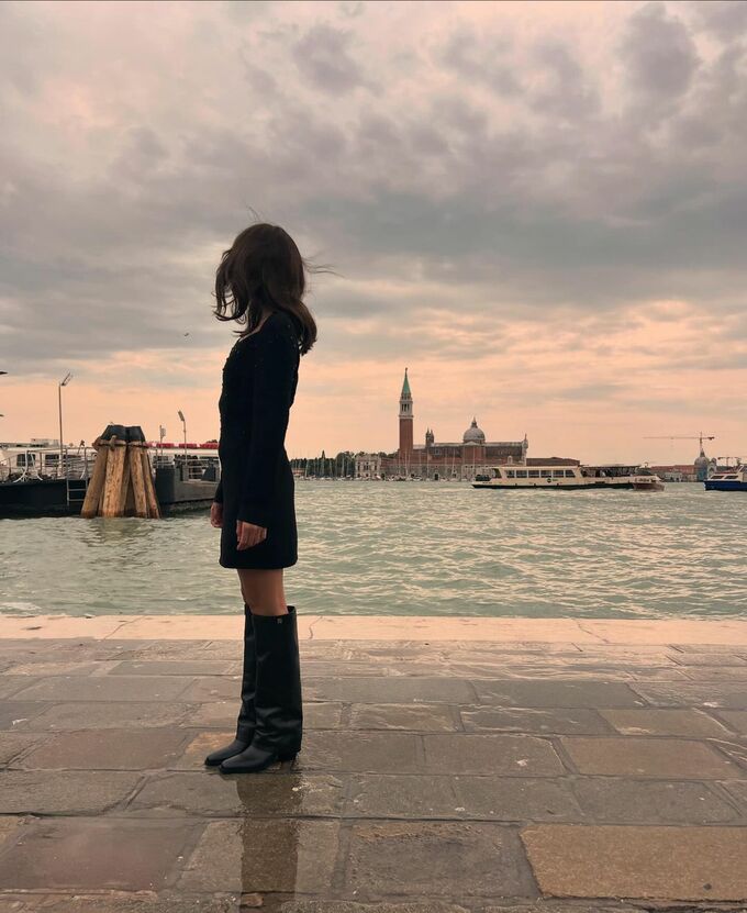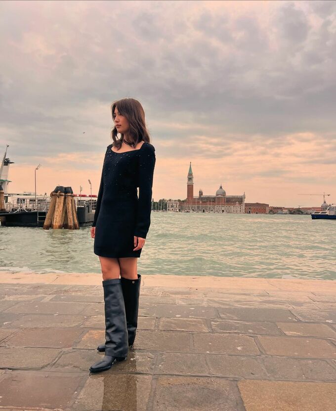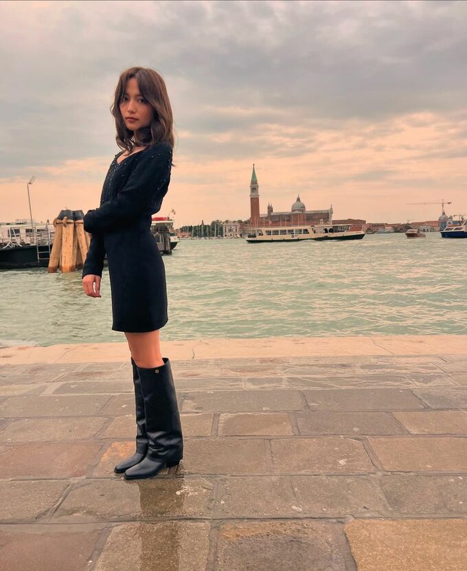 川口さんが公開したのは、ファッション誌の撮影で訪れたベネチアでのオフショット。“水の都”ベネチアの街を背景に、黒のミニワンピースと黒のレザーブーツを合わせ、ポーズを決めている川口さんは、物憂げな表情を浮かべています。
