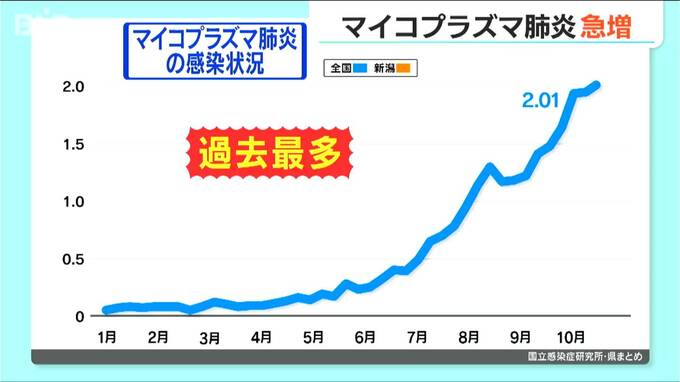 流行が続いているマイコプラズマ肺炎について、全国の患者数が4週連続で過去最多を更新し、新潟県内でも患者数が急増しています。マイコプラズマ肺炎は高熱や全身のだるさなどの症状のほかに、咳が長引くのが特徴…