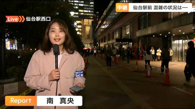 それでは、現在のJR仙台駅前の様子を伝えてもらいましょう。南さん。南真央記者:JR仙台駅西口のペデストリアンデッキにいます。現在は、帰宅時間ということもあり、学生や会社員などの人出がかなり多くなっていま…