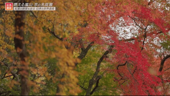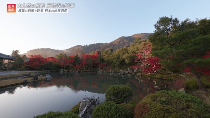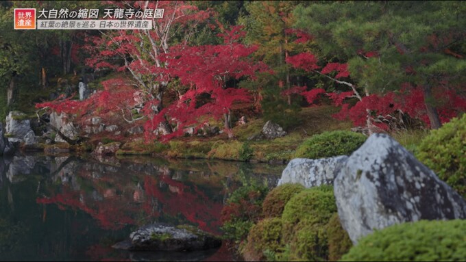 紅葉のシーズンに庭に面した方丈から眺めると、色づいた木々が池の水面にも映り、庭園の背後にはやはり色づいた嵐山が借景として広がる…番組がこれまで撮影した紅葉の中でも特に美しいシーンです。