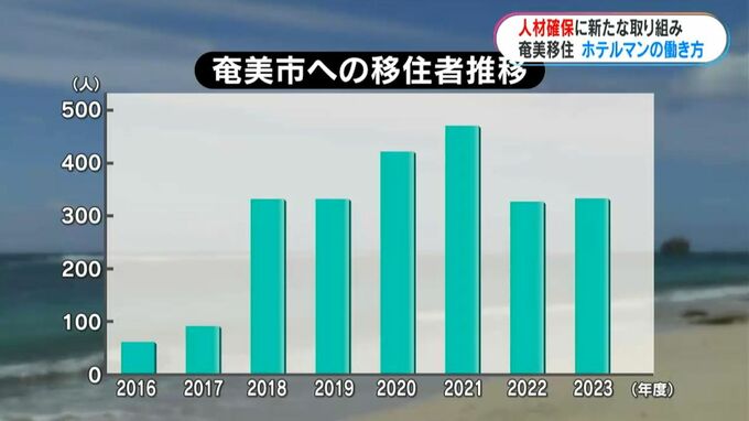 島外から奄美市へ移住してきたIターン者の推移のグラフです。2016年以降増え続け2021年には470人でしたがここ数年は300人台。依然、労働力不足は深刻です。