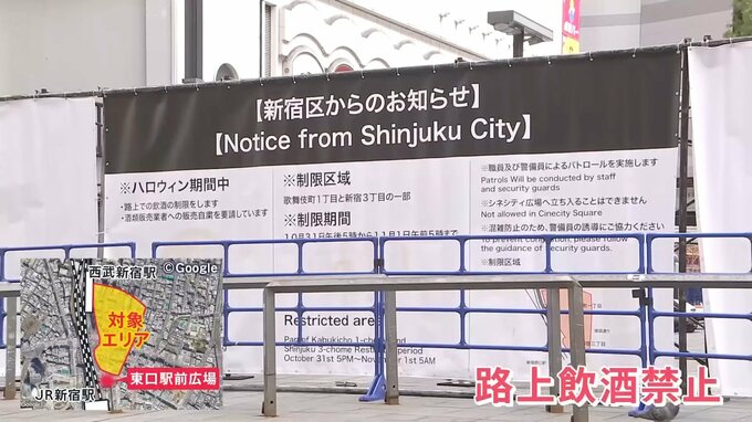 新宿・歌舞伎町の中心部にある広場は白い幕で囲われ、周辺エリアは翌日午前5時まで路上での飲酒が禁止に。渋谷駅前でもハロウィーン前日から、多くの人が集まる「ハチ公像」周辺が封鎖され、渋谷センター街は一方通行になるなど規制がしかれています。
