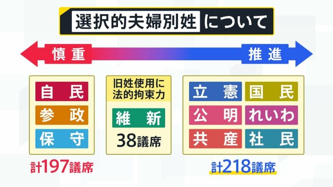 「選択的夫婦別姓」についてポイントとなるのは、38議席持っている日本維新の会です。戸籍制度を維持して公的機関などでの旧姓使用に法的拘束力を持たせることを主張しています。日本維新の会がどちら側につくかで今後の動きが決まってきそうです。
