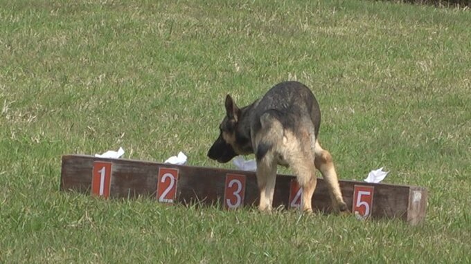 審査は同じ人のにおいがついた布を5枚の布の中から嗅ぎ分ける「臭気選別」と、人が歩いたあとの臭いを追って遺留品にみたてた木片などを見つける、「足跡追及」の2つの部門で行われました。