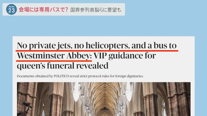 参列する各国の首脳らに対して、民間の航空機での入国を求め、ヘリコプターでのロンドン上空の飛行自粛も要請、さらに葬儀会場には用意された専用バスで向かうよう求めたというのです。「厳重な警備と交通規制」をその理由としています。