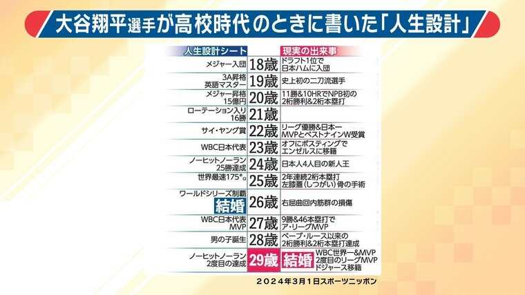 改めて大谷選手のこれまでを振り返ってみます。大谷選手と言えば17歳のときに書いた70歳までの『人生設計』が有名です。人生設計シートに書かれた目標と実際の出来事を比べてみると、時期のずれはあるもののメジャー入団、ローテーション入り、WBC日本代表、結婚、ワールドシリーズ制覇など、その多くがすでに実現しています。