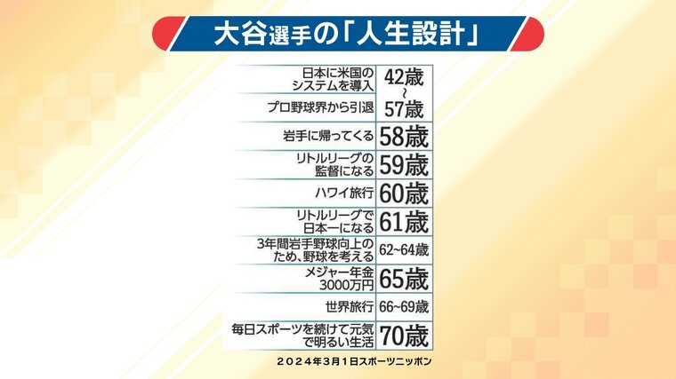 では、大谷選手の“未来”はどうなるのか?人生設計では、37歳「長男が野球を始める」、38歳「結果が出ず引退を考え始める」、39歳「来年での引退を決意」、40歳「引退試合」、41歳「日本に帰ってくる」など、リアルな内容が見られます。