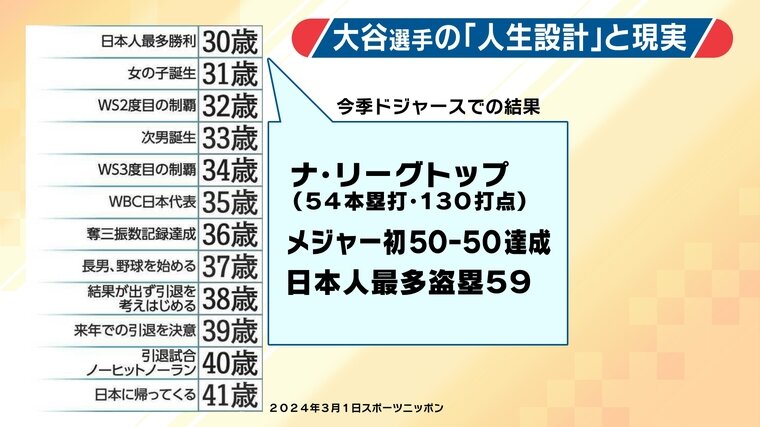 29歳のときにはWBC世界一と2度目のリーグMVPを達成、また、ドジャース移籍や結婚もありました。そして今シーズンはナ・リーグトップの54本塁打・130打点の成績を残し、メジャー初の「50-50」を達成、日本人最多盗塁も成し遂げました。