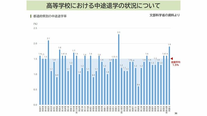 高校の中途退学率については、ワーストが奈良県で2.3%。以下宮城県2.1%、沖縄県1.9%、茨城県1.8%と続きます(全国平均1.5%)