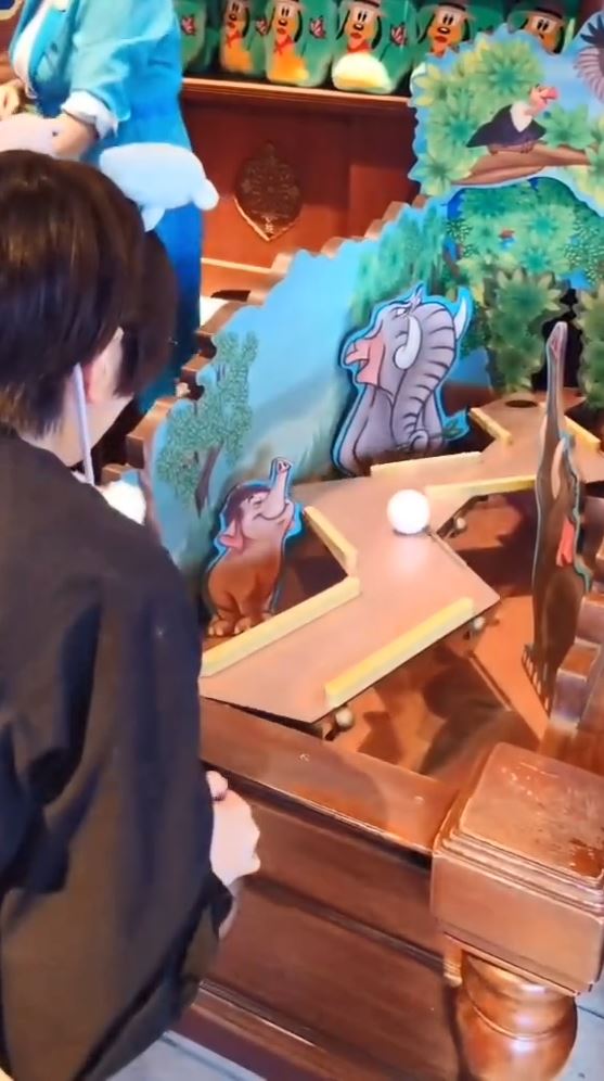 志田さんは「#ディズニーランド」「#ジャングルカーニバル」「#ボール転がし」とハッシュタグを追加しつつ「ドキドキ。」と一言だけを添えて動画を投稿。まさに「ジャングルカーニバル」のゲームセンターで、左右に傾く道をくねくねと動かしながら、ボールをゴールまで運ぶチャレンジ。