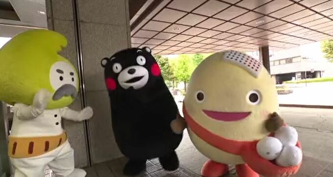 テミじぃが出迎える北陸放送を訪れたのは熊本県のご当地マスコットキャラクター「くまモン」と和倉温泉の「わくたまくん」です。