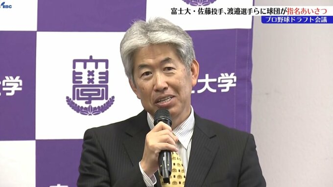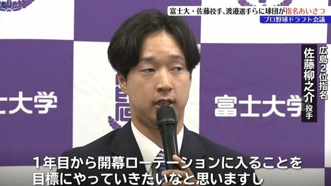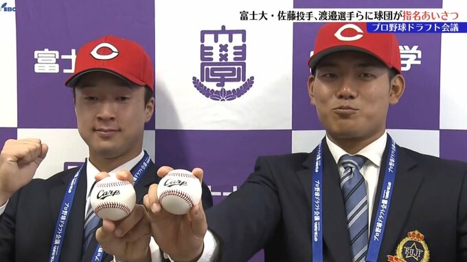 プロ野球広島東洋カープの球団関係者がきょう富士大学を訪れ、ドラフト会議で2位指名した佐藤柳之介投手と4位指名した渡邉悠斗選手に指名のあいさつを行いました。