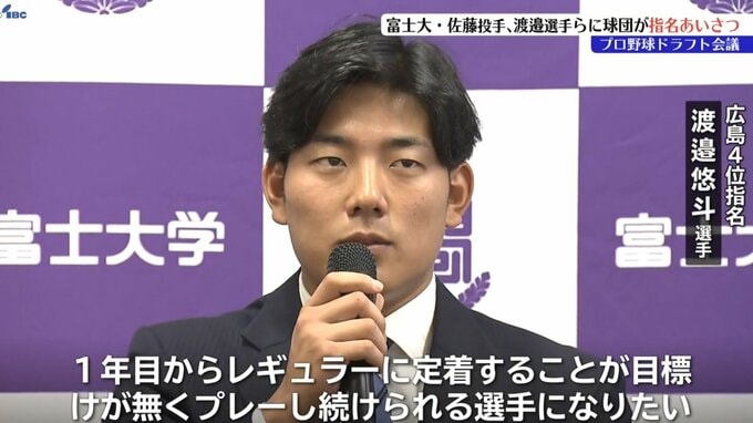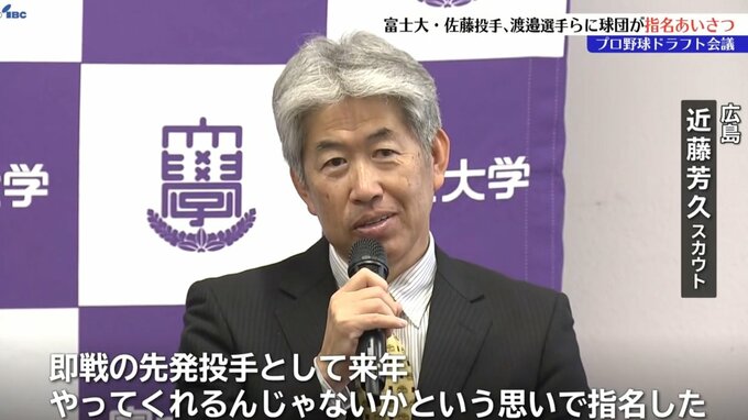 「即戦の先発投手、来年やってくれるんじゃないかという思いで指名しました。新井監督も期待して渡邉君はバッティングですね。勝負強いバッティングを期待しています」