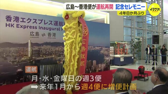広島と香港を結ぶ国際定期便が4年8か月ぶりに再開し、広島空港で記念のセレモニーが開かれました。