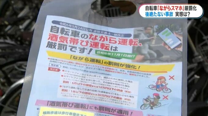 罰則が強化された1日、鹿児島市のJR谷山駅では、警察官ら9人が通勤・通学で自転車を利用する人たちに注意を呼びかけました。