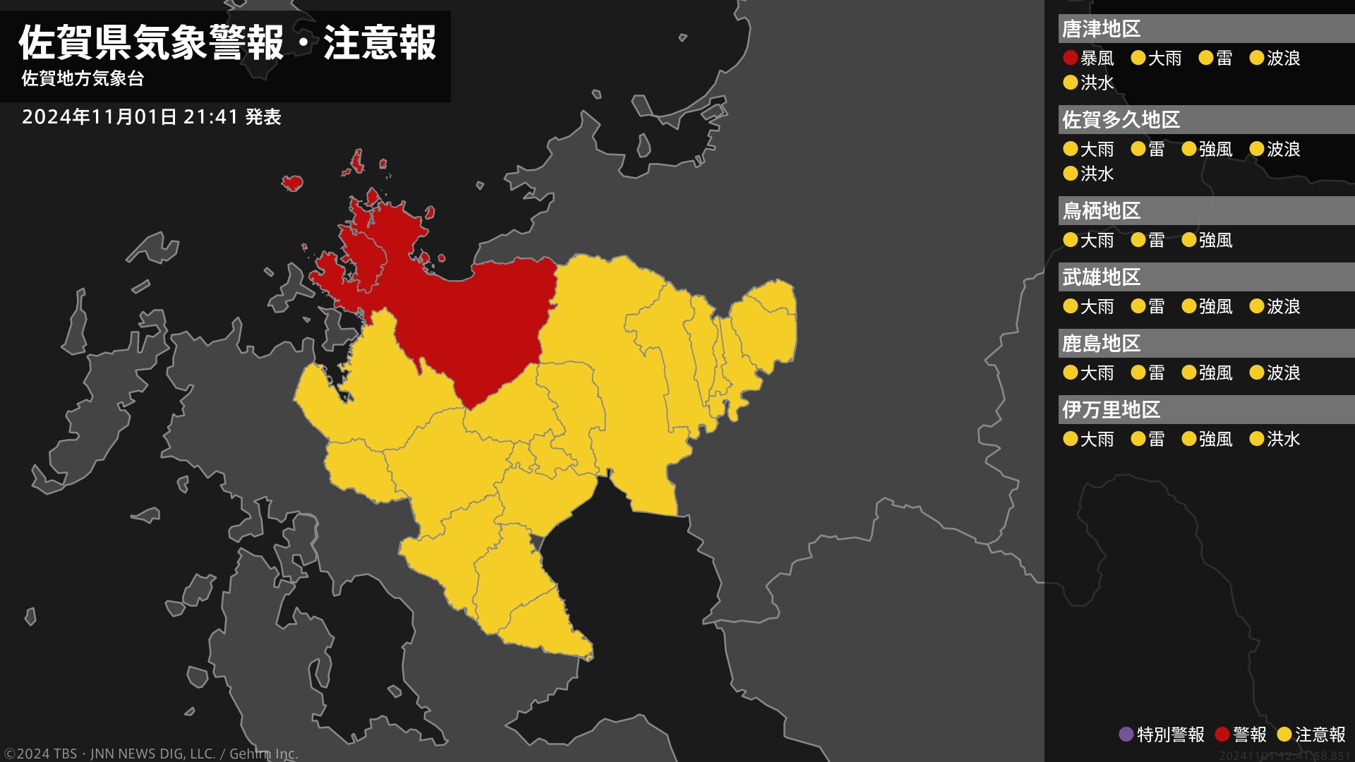 気象台は、午後9時41分に、暴風警報を唐津市、玄海町に発表しました。