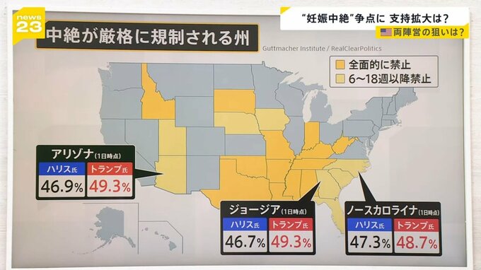 5日に大統領選の投開票を控え、人工妊娠中絶が厳格に規制されているのは全米で21州に上り、激戦になっているところも出ています。