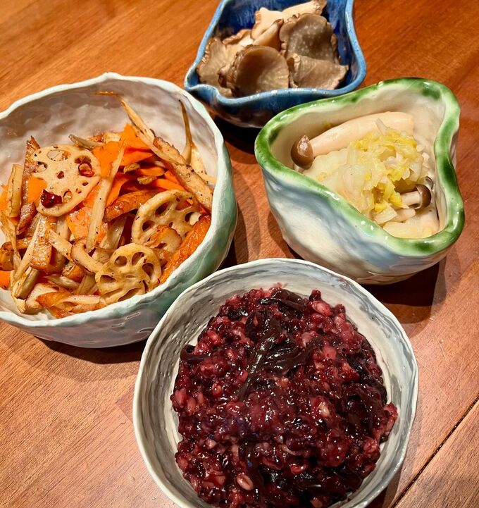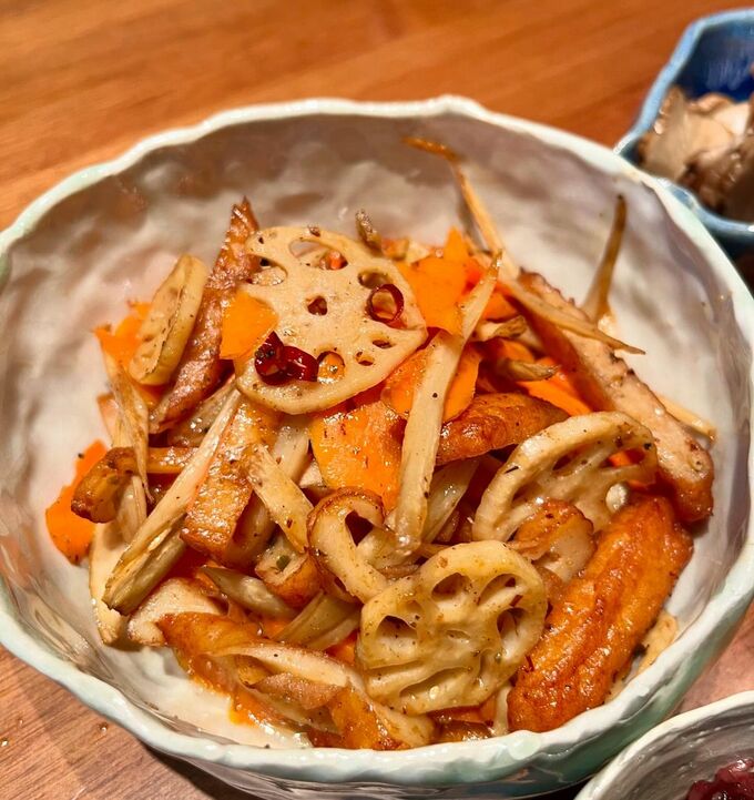 さらに「きんぴらにレンコンを入れるのが好きです」「白菜ときのこの煮浸し」「秋田でいただいた いぶりがっこ。」と、各々の料理の写真も投稿。