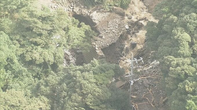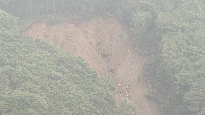 上空からの映像では山頂付近の山肌が大きく崩れているのが確認でき、流れ出た大量の土砂が海まで流れ込み、途中にある県道19号の一部が土砂によって流され崩落しています。