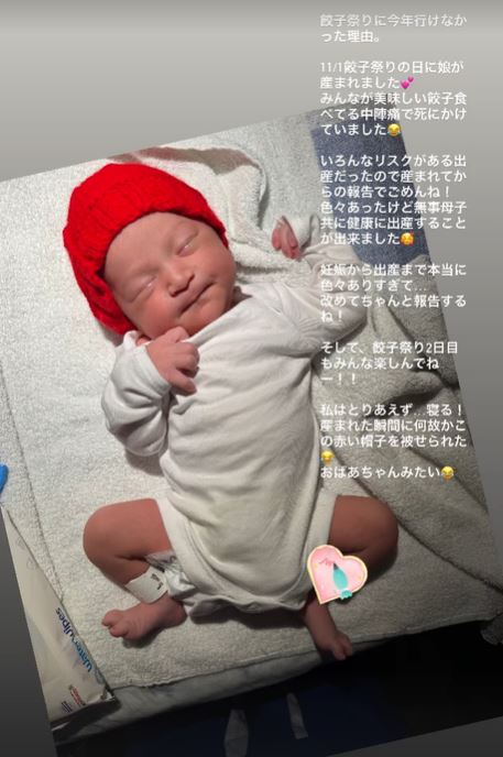 餃子評論家や、宇都宮餃子PR特命アンバサダーとしても活動する橘田さん。赤いニット帽を被り眠る赤ちゃんの写真とともに「餃子祭りに今年行けなかった理由。」と書き出し、「11/1餃子祭りの日に娘が産まれました」と報告。