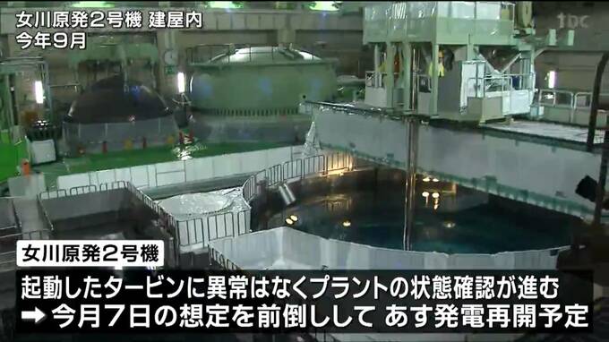 東北電力によりますと1日夜、起動したタービンに異常はなくプラントの状態確認が進んだことから今月7日に想定していた発電の再開を前倒しして3日発電を再開する予定だということです。