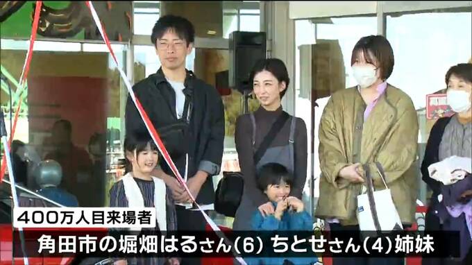記念すべき400万人目の来場者になったのは、家族7人で訪れた角田市の堀畑はるさん(6)とちとせさん(4)姉妹です。記念セレモニーではシージェッター海斗から記念品として萬画館オリジナルグッズと400万人目の来館証明書が手渡されました。