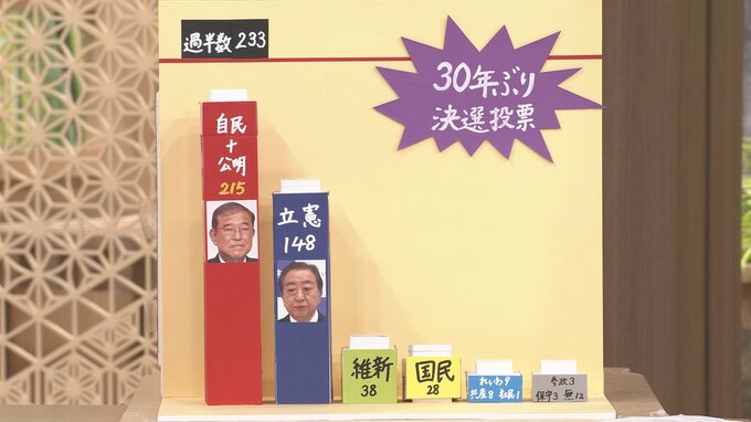 自民・石破総裁と立憲・野田代表が残るとみられ、維新や国民が立憲に乗らなければ、石破さんが総理大臣に選ばれる見通しです。